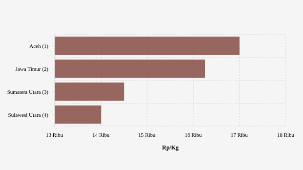 Harga minyak goreng curah harian di pasar modern Aceh menjadi yang termahal se-Indonesia dengan harga jual Rp 17.000 per kg. Dibandingkan sebulan lalu, harga minyak goreng curah di provinsi ini tidak mengalami perubahan. Harga jual tertinggi yang pernah dicatat di wilayah ini adalah Rp. 31.500 per kg.